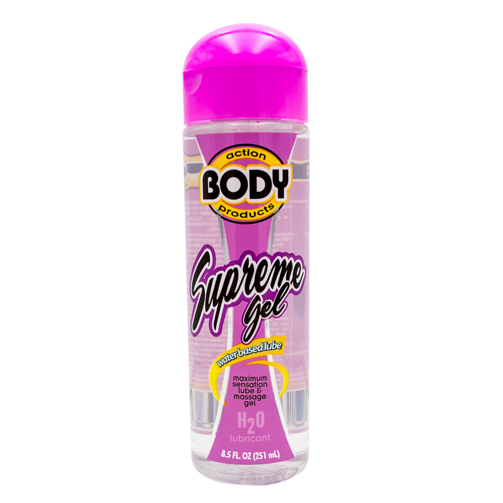 Supreme Gel is a water based lubricant formulated with a combination of natural and modern ingredients to achieve the highest obtainable level of lubrication. This formula works in harmony with your body to protect against friction by supplementing your natural moisture which enhances intimacy.• Water Based Formula• Higher viscosity to hold moisture longer• Long lasting• Clear and odorless• Body Action Supreme Gel will provide you with a smooth silky texture that moisturizes with just a few drops.