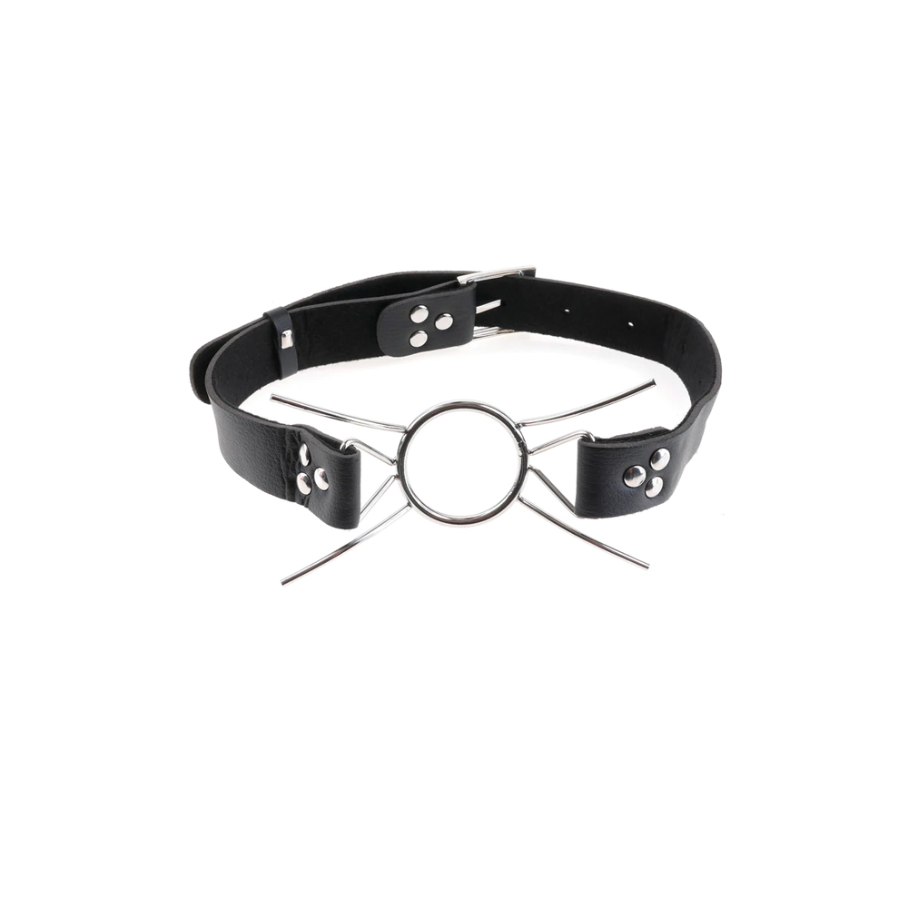 When wide-open isn’t wide enough, the Fetish Fantasy Extreme Spider Gag will get the job done! This extreme gag consists of a steel ring with four curved metal “legs” attached to the ring. The gag and legs prevent the mouth from closing, leaving your subject’s mouth wide open for whatever you wish to put in it. The diameter of the ring measures 1.5″, and the gag connects to a leather strap that buckles in the back and keeps the gag firmly in place. One size fits most.