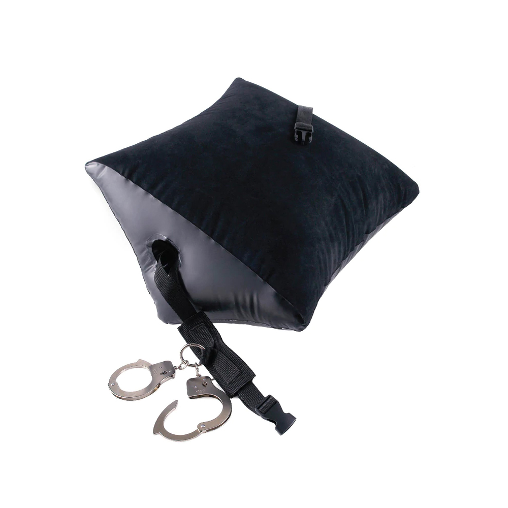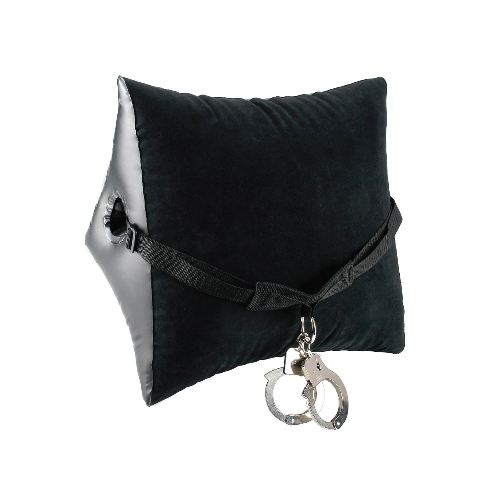 Let your imagination take you beyond your physical limits with the incredible Deluxe Position Master with Cuffs. This inflatable position pillow has a hollow center designed to anchor a super strong nylon strap, which then connects to a pair of heavy-duty metal cuffs. Once your subject is bent over the wedge-shaped pillow and strapped in, they’re unable to move or escape while their hands are cuffed to the strap’s heavy-duty O-ring centerpiece. The inflatable wedge allows you to explore and enjoy new positions you never thought were possible, all while your subject is comfortably restrained! The velvety-soft flocked vinyl feels great against your skin and it’s made to play hard. Insert the nylon strap through the Position Master while it’s deflated, then inflate the wedge and adjust the strap to fit snugly around your partner. The thick nylon strap features a plastic clip and buckle to prevent your lover from escaping, and the metal cuffs feature quick release levers just in case you lose the keys. The air seal valve makes inflating the wedge a snap, and when the fun is over, simply deflate the Position Master and it’s ready to go where you go. It’s perfect for those romantic getaways and no one will know what’s in your bag!