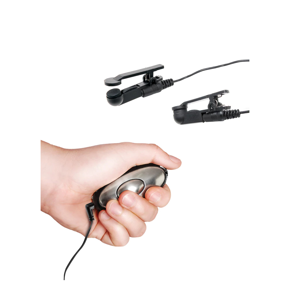 Give your sex life a charge with the Shock Therapy Electric Nipple Clamps. Perfect for beginners and those new to electro-sex, these spring-loaded clamps plug into the electro-power unit and provide thrilling e-stimulation. Choose a setting on the power unit’s dial to control the intensity and go from a sensuous tingle to a throbbing tap in seconds. Switch between “SLOW” or “FAST” to control the frequency of the shock, or adjust the dial to control the strength of the shock. The Luv Touch compact control unit sends electrical impulses to the clamps and can be used alone as a hand massager or together with the clamps. To use the control as a hand massager, switch to “IN” mode. The oval center piece delivers the shock once your palm touches any other part of the metal. To use the power unit with the clamps, switch it to “OUT” mode and connect the clamp’s plug-in jack.
