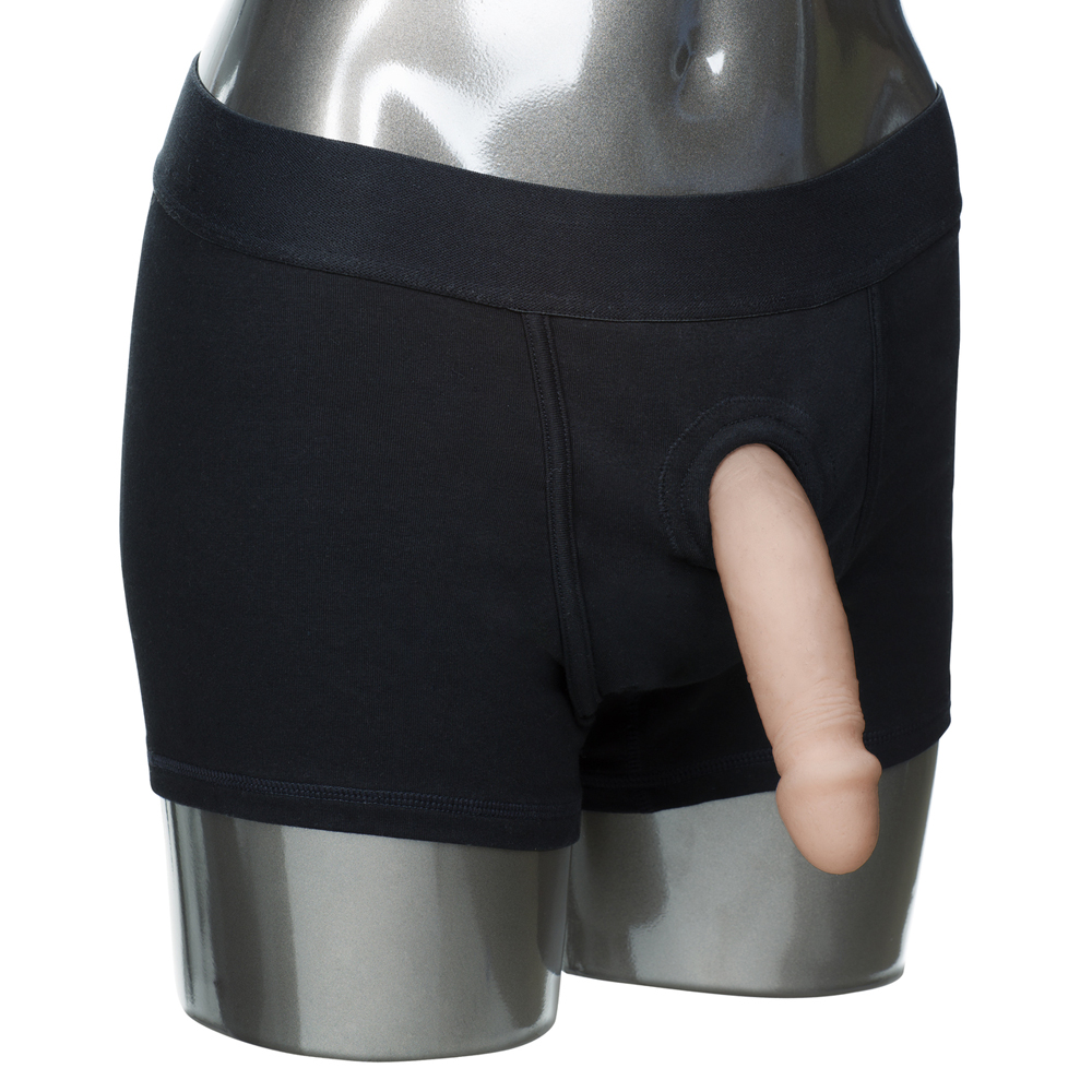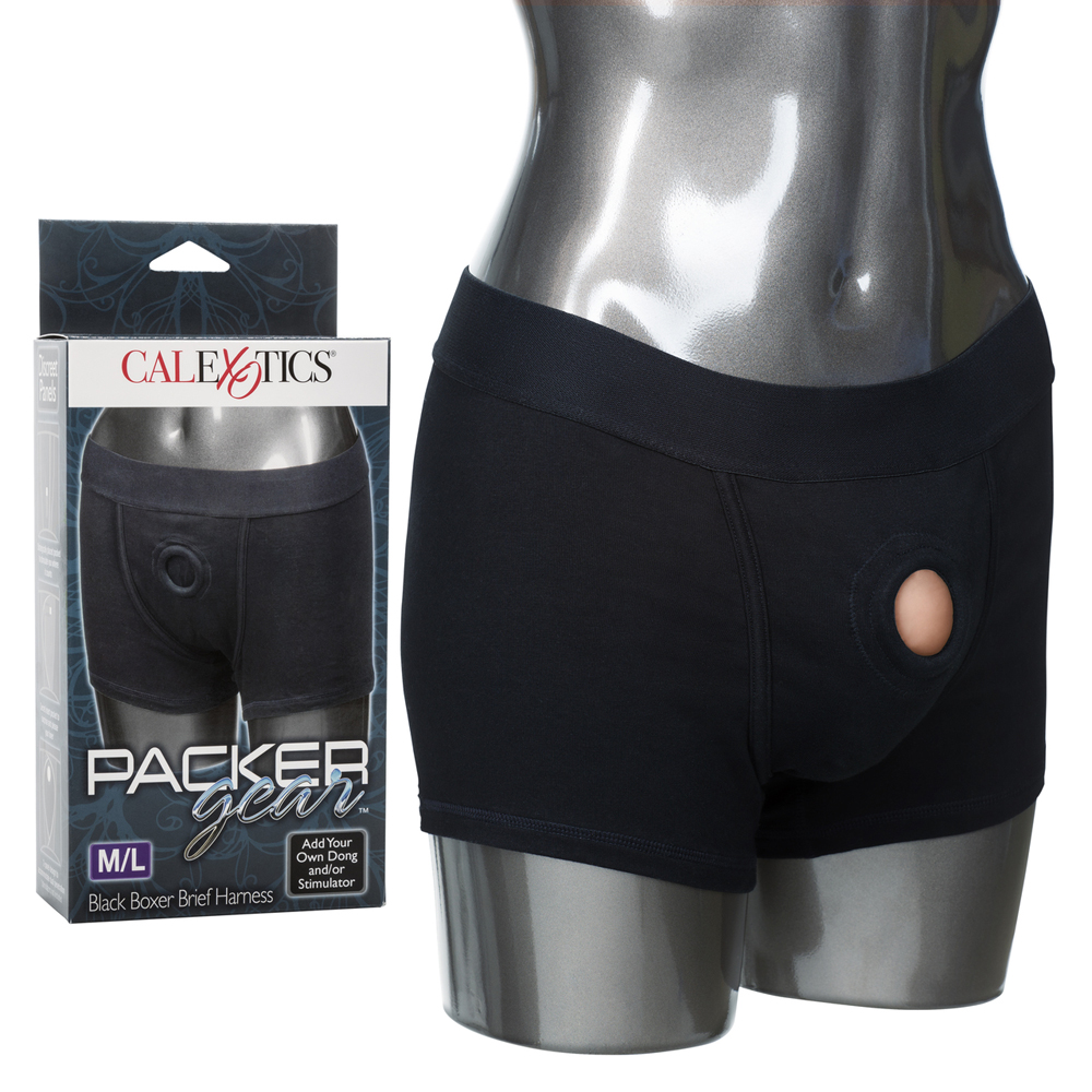 Comfortable and supportive, the Packer Gear Black Boxer Harness is designed for the ultimate instyle and comfort when fashioning your favorite packer or stimulator. The fashionable masculine cut brief has a classic boxer shape, with discreet internal pockets to store your favorite vibrating stimulator. Slip on the boxers, insert a packer, probe or dong, and experience orgasmic one-on-one action.The washable Packer Gear Black Boxer Harness is made from soft, stretchy and comfortable cotton/spandex and has an extra wide waistband for additional support. The boxer’s soft lining features internal pockets, and an internal strap, to secure your preferred pleasure tool in place. The reinforced 2-panel design also features a super stretchy O-ring that easily accommodates most sizes of penetration pleasure-makers.Ideal for first time and experienced users, the Packer Gear Black Boxer Harness has no external straps to adjust fully. Instead, the boxer shorts slip on like underwear for the ultimate easy comfort fit. To experience the fun of using the harness to support your erotic activities, all you have to do is select your favorite packer or stimulating toy through the specially-designed support ring. Inserting a vibrating stimulator, into the internal pocket, also means that you enjoy double the ecstasy.Discreet 2-panel design to accommodate dual penetrationReinforced O-ring stretches to accommodate most packers, dongs or probesSoft, stretchy and comfortableComfortable soft lin