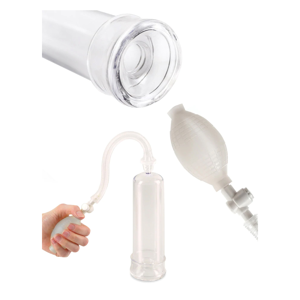 The Beginner Power Pump will give you the size and confidence you have always dreamt about without any harmful side effects. With each squeeze of the medical-style pump ball, your pleasure rod will grow bigger, thicker, and swell with power. Once you penetrate the smooth, flexible PVC opening, you’ll quickly discover throbbing, rock-hard erections that feel great and last and last with no midway performance letdowns! The clear vacuum tubes allow you to watch your cock grow, and the quick-release valve relieves pressure with a push of the button. Beware of imitations only this potent pump can deliver results that truly satisfy! To prolong ejaculation, slide the included enhancement ring over your shaft so that it’s nice and snug. The tight squeeze will prolong cumming, maintain your erection, and extend the fun. When you’re done, simply detach the cylinder from the vacuum hose and restore it’s like-new quality with Pipedream Toy Cleaner and warm water. High-Intensity Super Suction Medical-Style Pump Ball w/ Quick-Release Valve Perfect For First-Timers