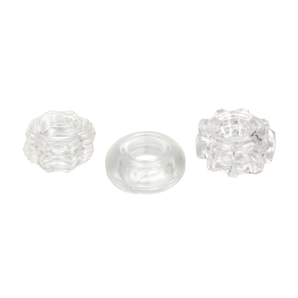 Spice up the night with the versatile Reversible Ring Set. The 3-piece set of erection enhancers is ideal for maximizing your erotic pleasure, and can be comfortably worn during foreplay fun or while enjoying solo play. The easy to use stretchy rings are thick and durable, and perfect for first time and experienced users.The fully reversible trio features tantalizingly textured ridges and sensual grooves for enhanced sensations during stimulation action. The supportive rings are designed to comfortably glide into place to provide stamina support, for extended ecstasy and an explosive climax. Let your imagination run wild. Use them individially as erection, scrotum, and “full coverage” rings. Try them together for a thicker ride. The options are endless as you prepare for ultimate mind-blowing pleasure and an unforgettable encounter.To heighten sensitivity even further, always use a quality lube with this enhancement toy. Before and after play, clean the erection keeper rings with mild soapy water or a toy cleaner spray..75”/2 cm (ring diameter)Ultra thick and durable 3-ring support setStretchy and comfortableRidges and grooves for added sensationsReversible design for customized and versatile useMATERIALS: TPR