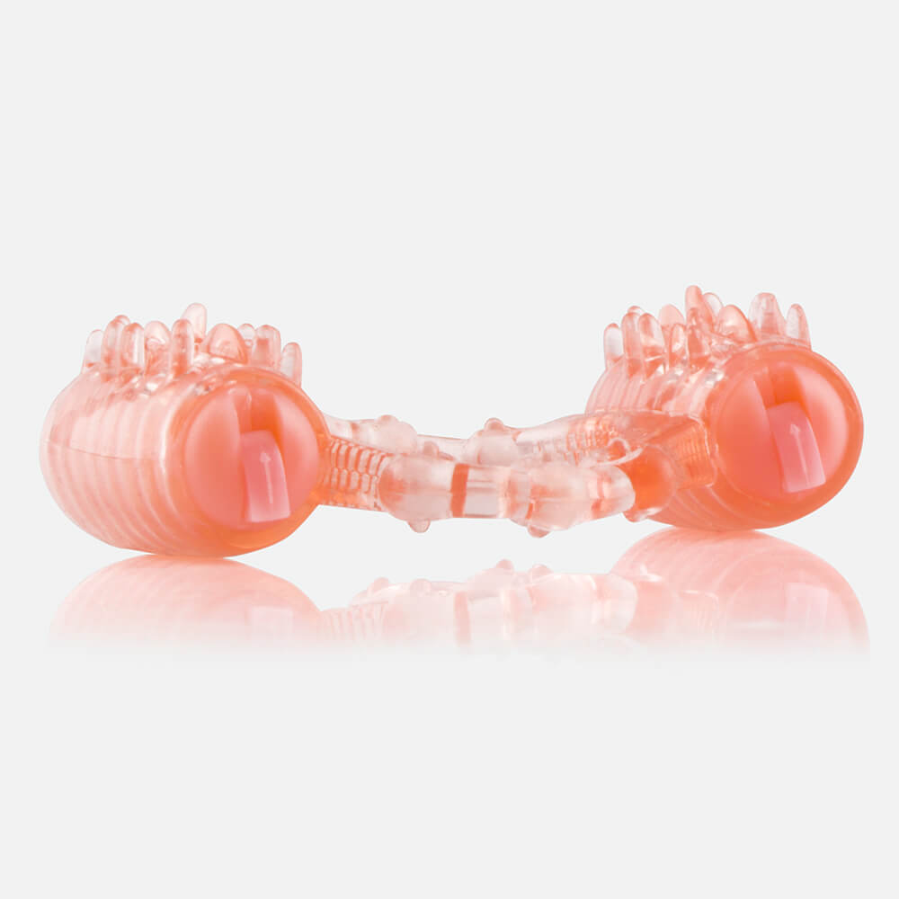 Two long lasting motors. Super Stretchy gel cockring. Pleasure knobs for him. Pleasure nubs for her.