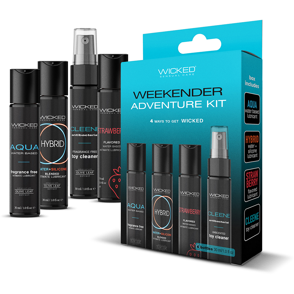 Four travel-sized Wicked Sensual Care favorites: Aqua water-based lube, Hybrid lube, Strawberry flavored lube, and Cleene antibacterial spray toy cleaner. Compact, discreet, and TSA-friendly for sensual adventures wherever you go.1 oz. Jelle Formulas:1 oz. Aqua1 oz. Hybrid1 oz. Strawberry1 oz. Cleene Spray Toy Cleaner